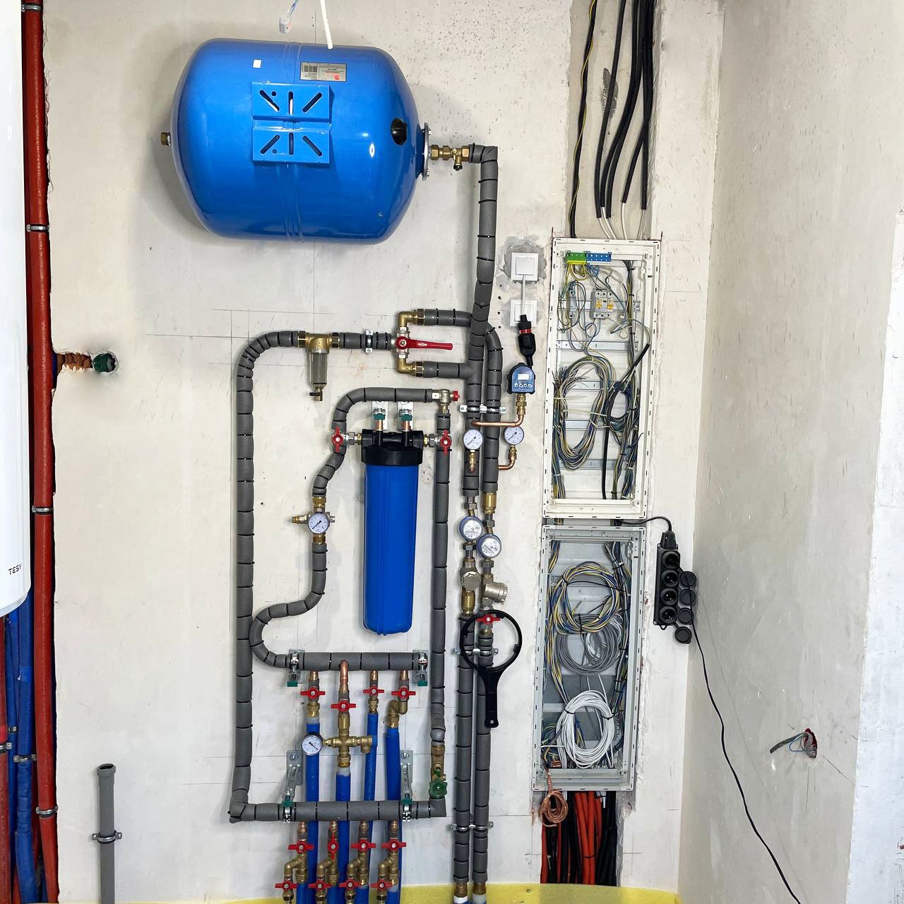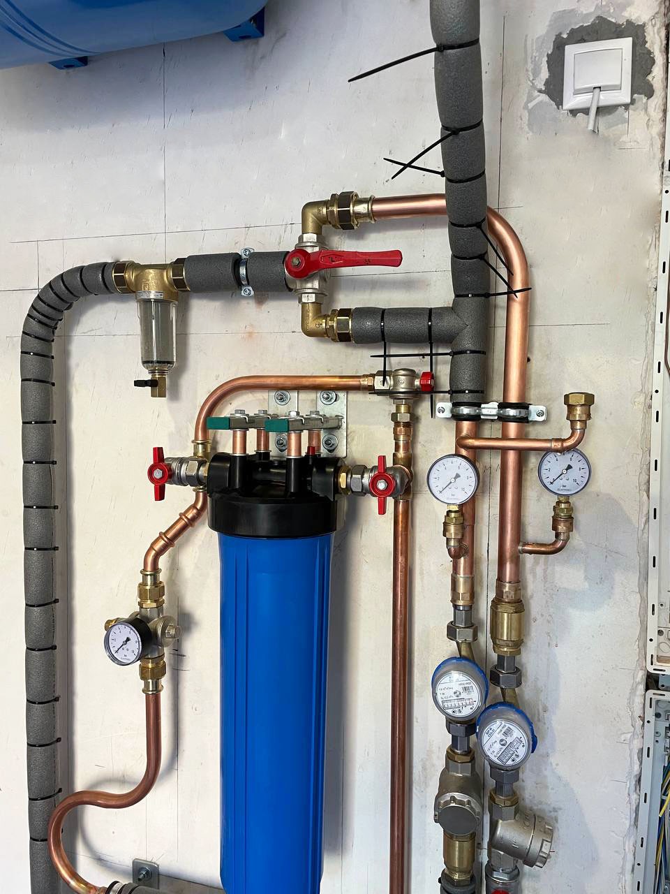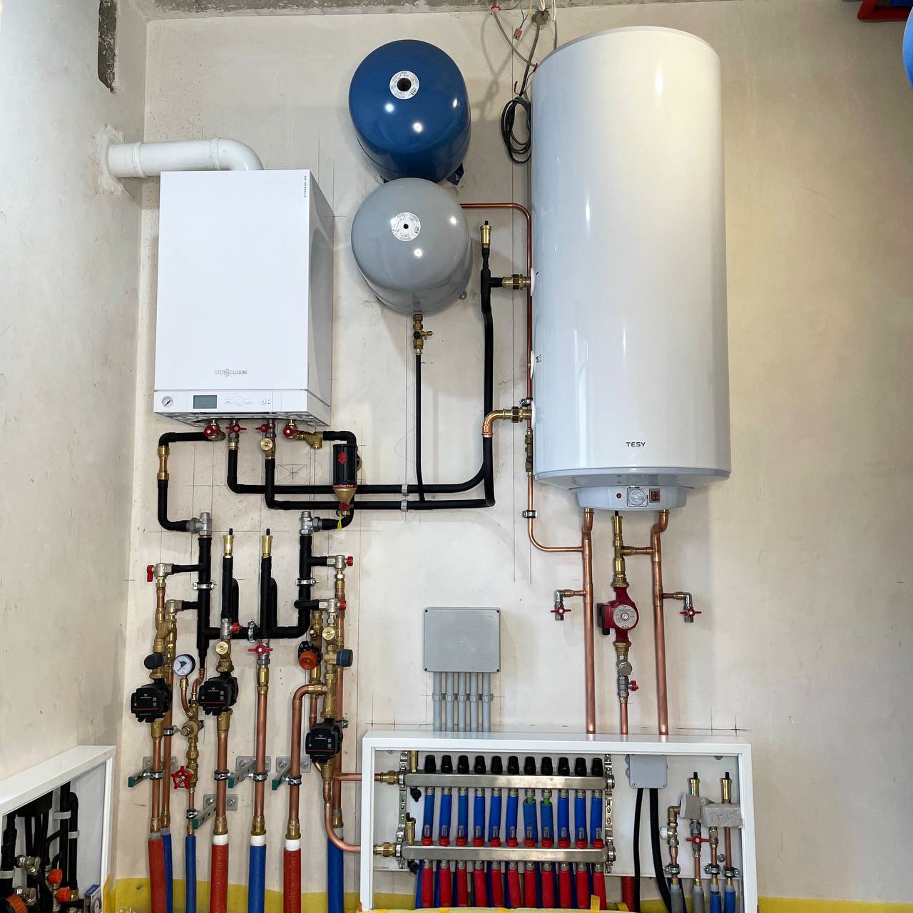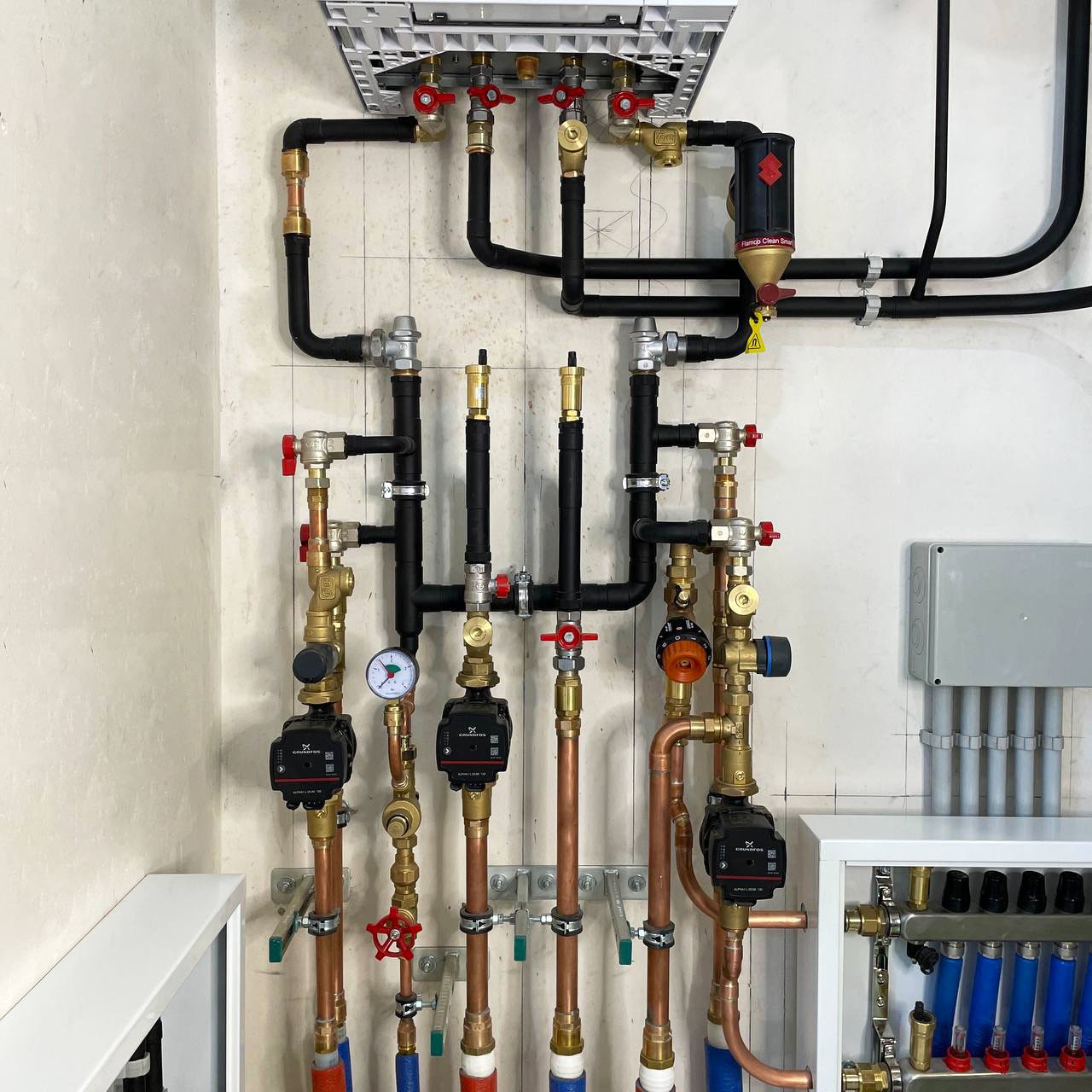 Выполнили монтаж котельной на первичных и вторичных кольцах. Нам нужно было разместить три насосные группы в минимальных габаритах, для чего использовали медь-пайку. Произвели обвязку водомерного узла для питания двух источников воды (центральный водопровод и скважина). Здесь установлен газовый котёл и бойлер косвенного нагрева.